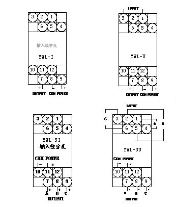 注: 1、YWF、YWL系列交流電流變送器輸入線從變送器外殼設置的穿孔穿過,不分極性。